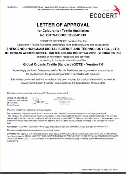 The Jettextile® textile pigment ink series represents Hongsam's principal technological achievement, developed through proprietary nanoscale aqueous processing techniques. The formulation achieves complete aqueous carrier systems without organic solvent content, thereby minimising volatile organic compound (VOC) emissions throughout the product lifecycle. Independent certification includes the OEKO-TEX Eco Passport, REACH compliance and Global Organic Textile Standard (GOTS) accreditation, satisfying the most stringent requirements of international brand owners and regulatory authorities.