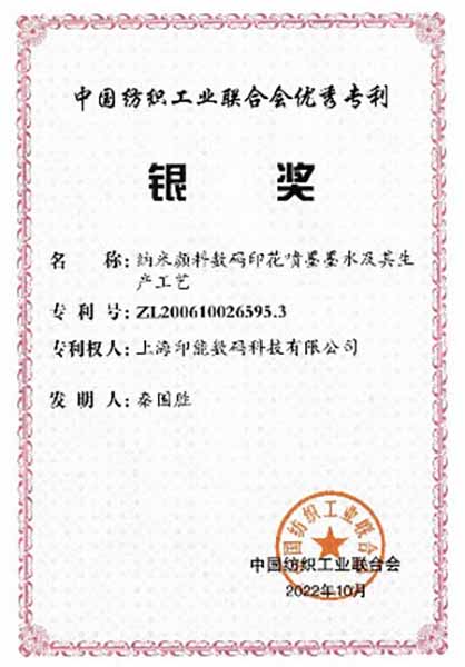 Intellectual property protection encompasses four national invention patents awarded between 2006 and present, with the technology recognised by the China National Textile and Apparel Council (CNTAC) through the 2022 Excellent Patent Silver Award and inclusion in the China Dyeing and Printing Association Energy-Saving and Emission-Reduction Advanced Technology Recommendation Catalogue (2016).